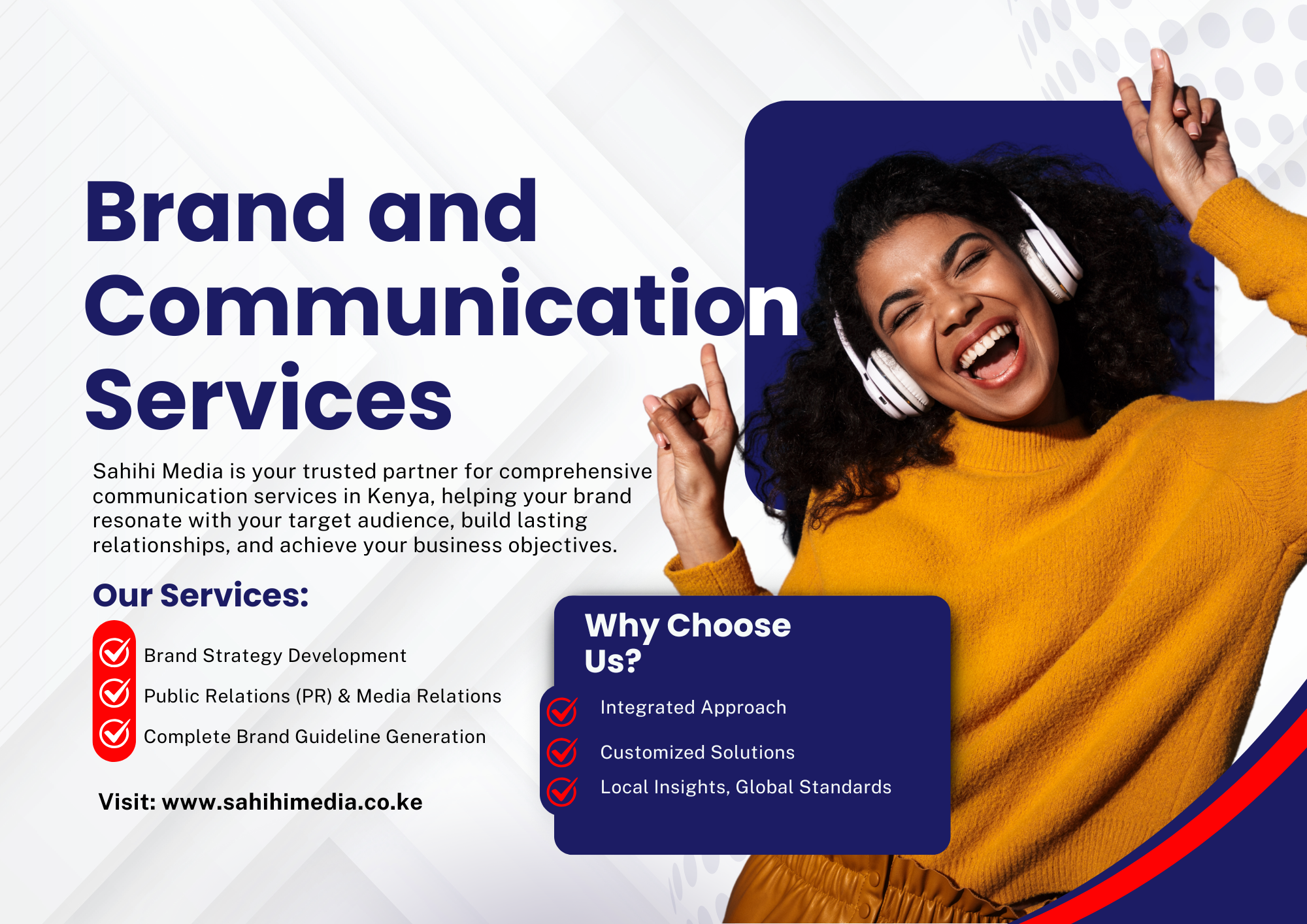Welcome to Sahihi Media, your trusted partner in creative solutions and digital innovation. We specialize in offering comprehensive services in Graphic Design, Communication, Videography and Photography, and Digital Marketing, tailored to meet the unique needs of your business.